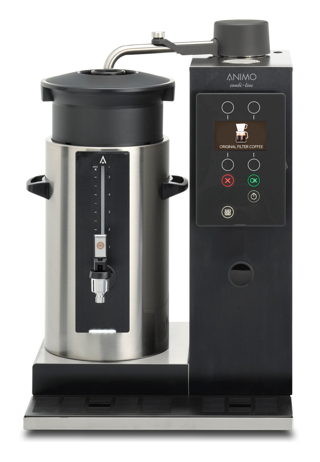 Animo ComBi-line CB 1×5 L er en kompakt og driftssikker urnetrakter designet for profesjonelle miljøer som trenger jevn kaffetilførsel gjennom dagen. Modellen leveres med en 10 liters beholder plassert på venstre side, noe som gjør den ideell for kantiner, restauranter og mindre serveringssteder med moderat volumbehov.