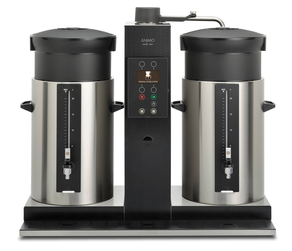 Animo ComBi-line CB 2×20 er en effektiv dobbel urnetrakter designet for profesjonell bruk der høy kapasitet og fleksibilitet er viktig. Med to separate beholdere på 20 liter hver, kan du brygge store mengder kaffe raskt og servere direkte fra beholderne – perfekt for hoteller, kantiner, catering og større arrangementer.
