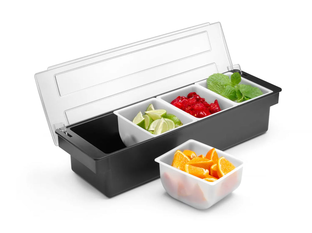 En condiment-holder med fire beholdere gir en ryddig og hygienisk løsning for oppbevaring av frukt, garnityr og krydder til drinker. Dette er et nyttig tilbehør for barer, restauranter og andre serveringssteder som ønsker enkel tilgang til ingredienser under cocktailtilberedning. De fire separate beholderne gjør det mulig å holde ulike råvarer adskilt, samtidig som et gjennomsiktig lokk beskytter innholdet mot støv og insekter.